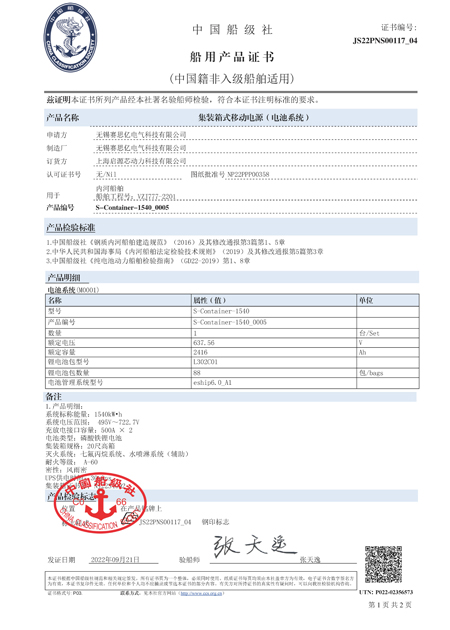 電池包、箱式電源及電池管理系統(tǒng)(BMS)獲中國船級社型式認(rèn)可。