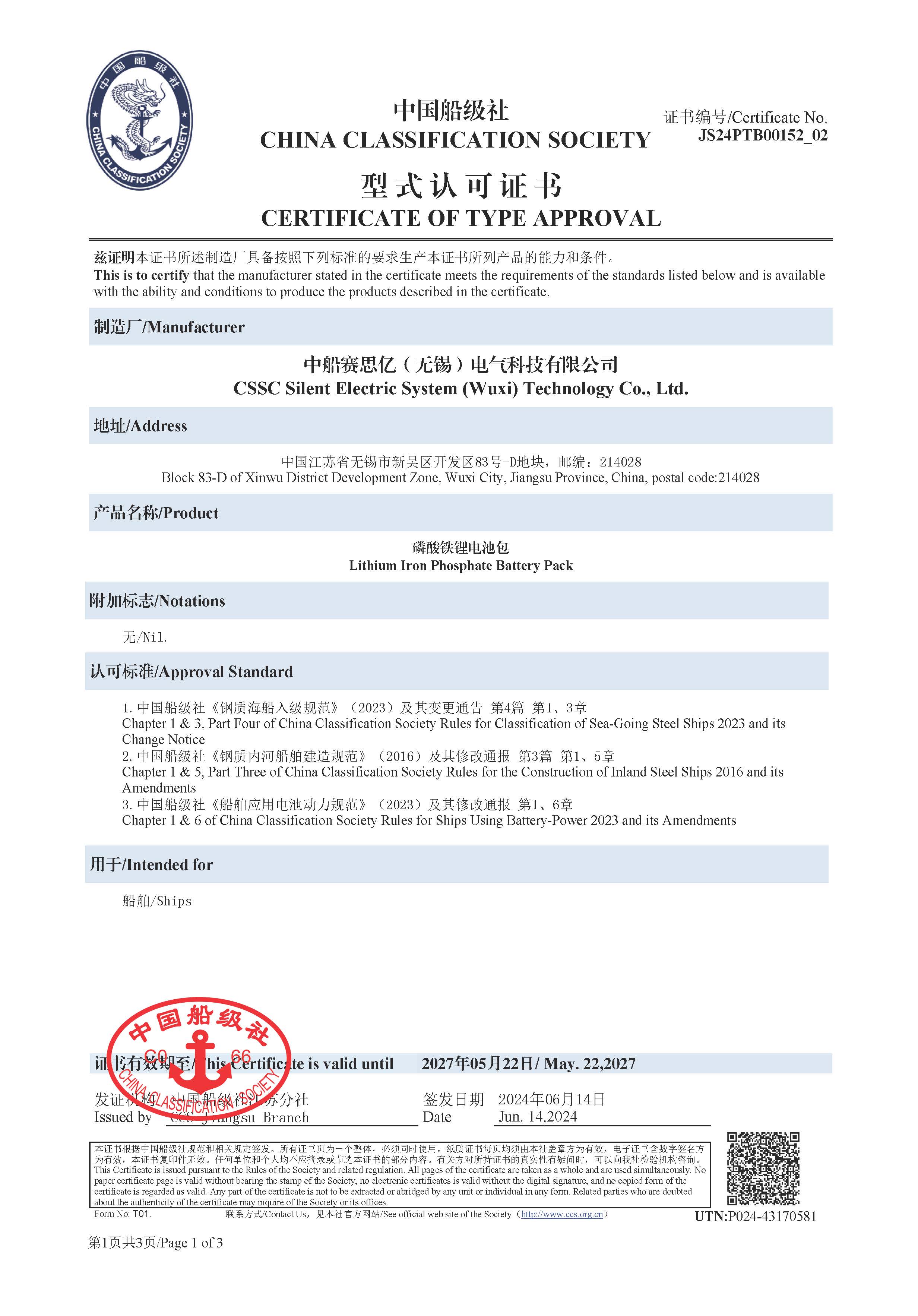 磷酸鐵鋰電池包(風(fēng)冷)型式認(rèn)可(CCS)