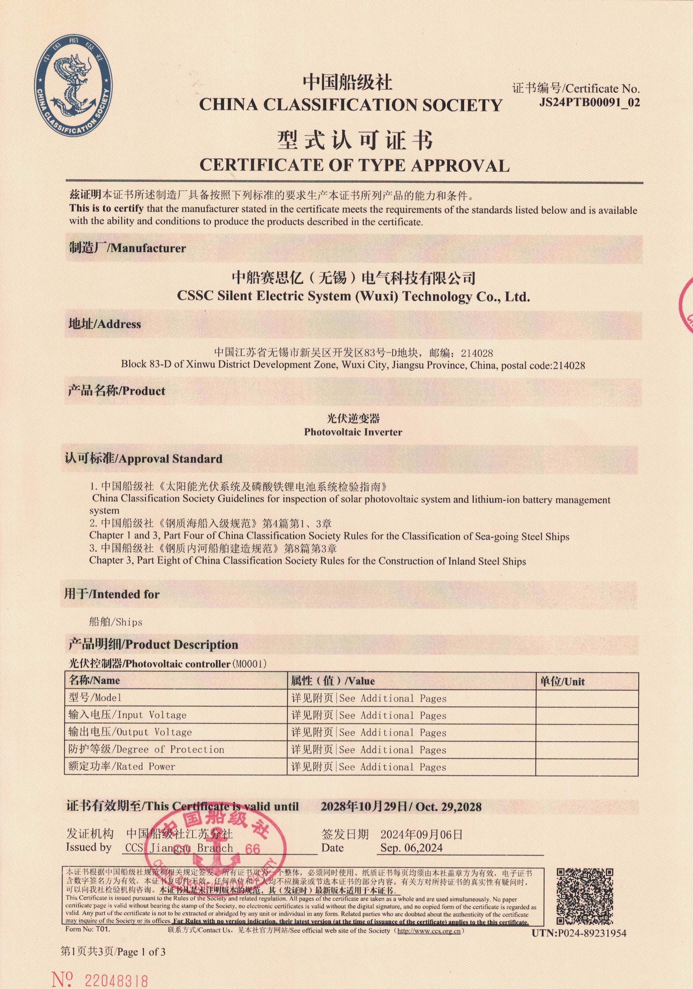 光伏逆變器型式認(rèn)可證書(CCS)