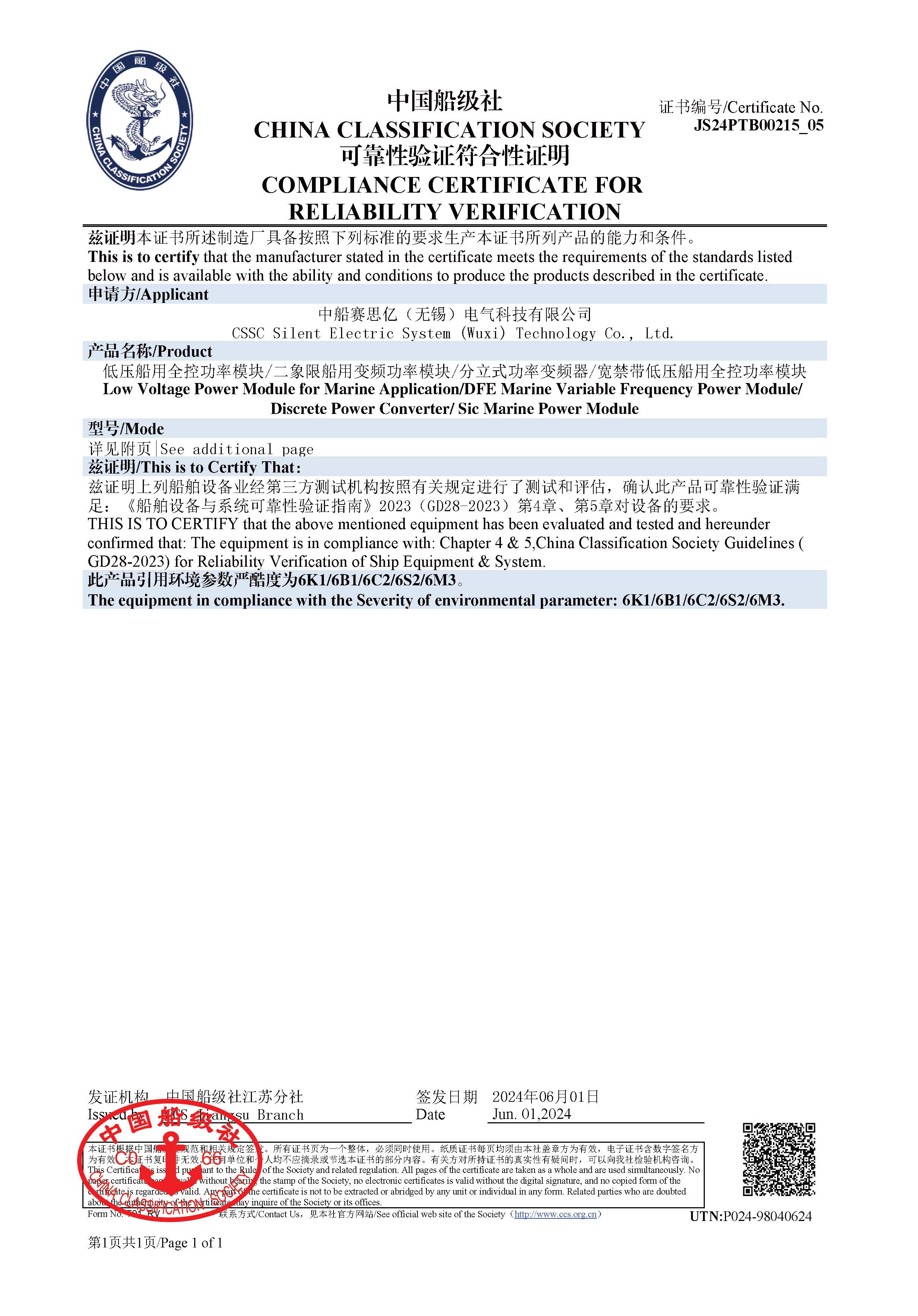 低壓船用全控功率模塊可靠性驗證符合性證明(CCS)