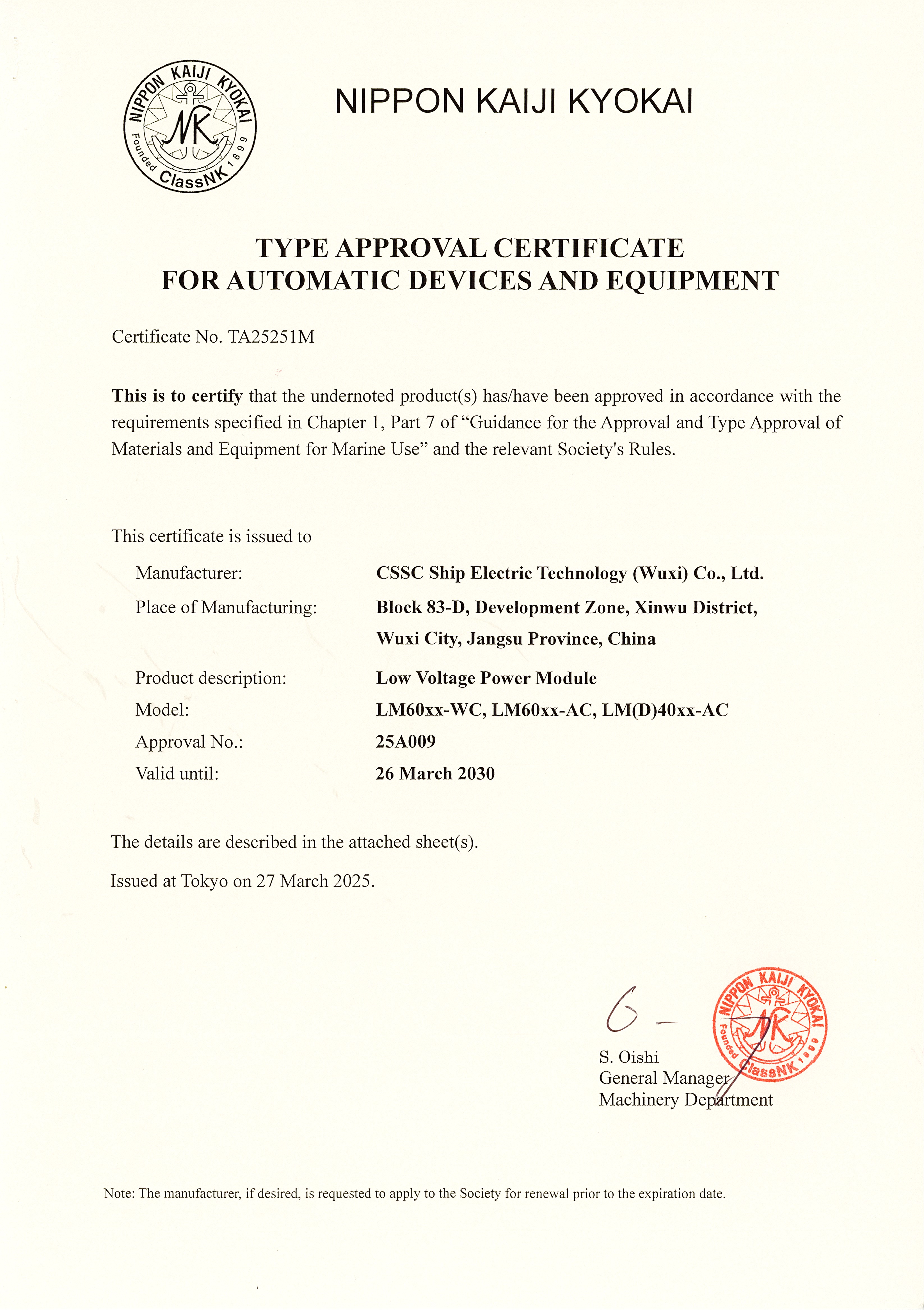 低壓船用全控功率模塊型式認(rèn)可(NK)