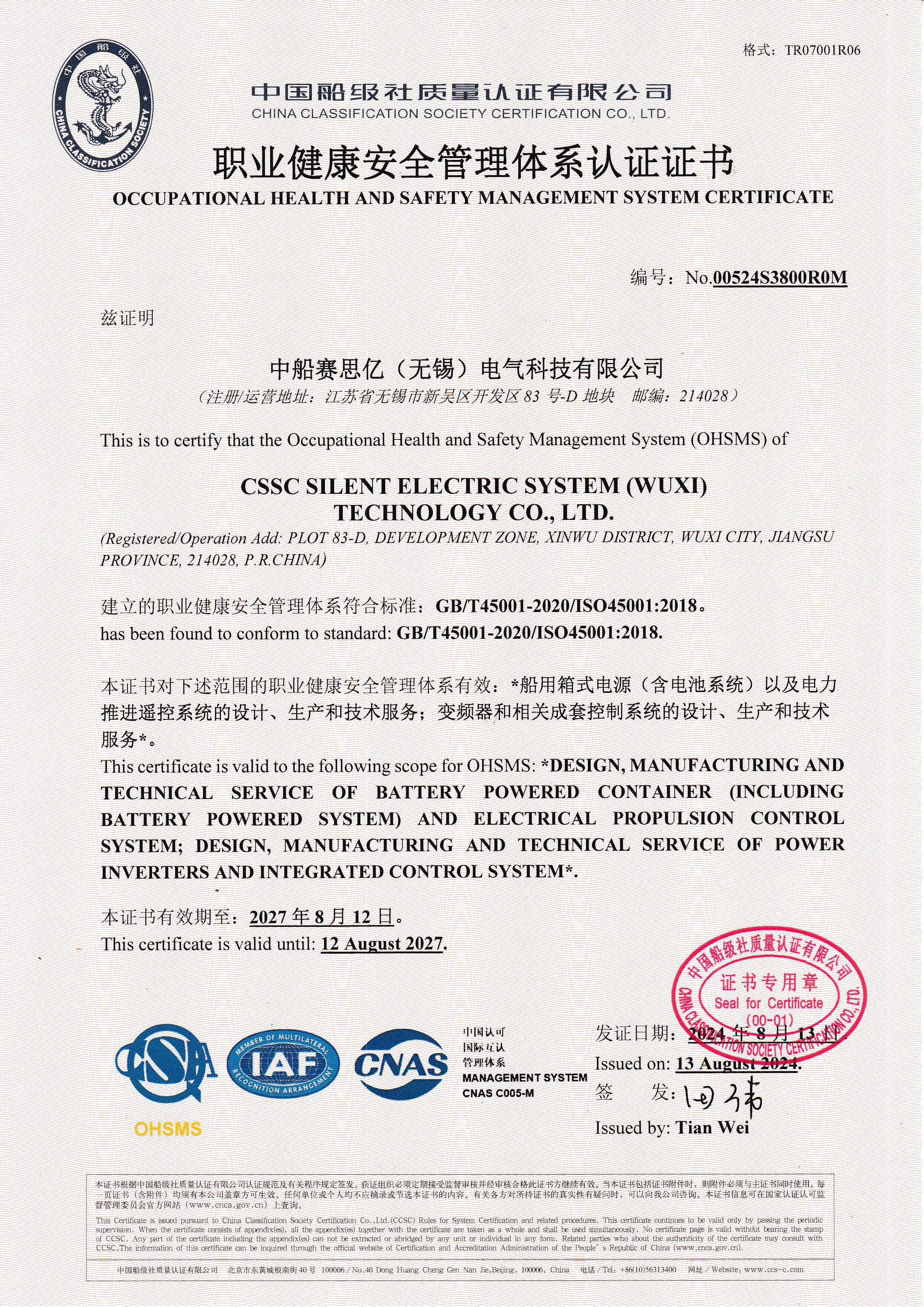 職業健康安全管理體系認證證書